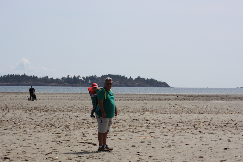 Nach einem reichhaltigen Frühstück bei Sonnenschein fuhren wir los in den nahe gelegenen Rathtrevor Provincial Park. Vom Parkplatz aus machten wir einen ausgedehnten Strandspaziergang ca. 600-700 m weit hinaus bis ans Wasser. Es schien, dass die Flut wieder eingesetzt hatte, denn mit den Schuhen im Sand an der Kante zum Wasser waren diese in kürzester Zeit vom Wasser umspült.