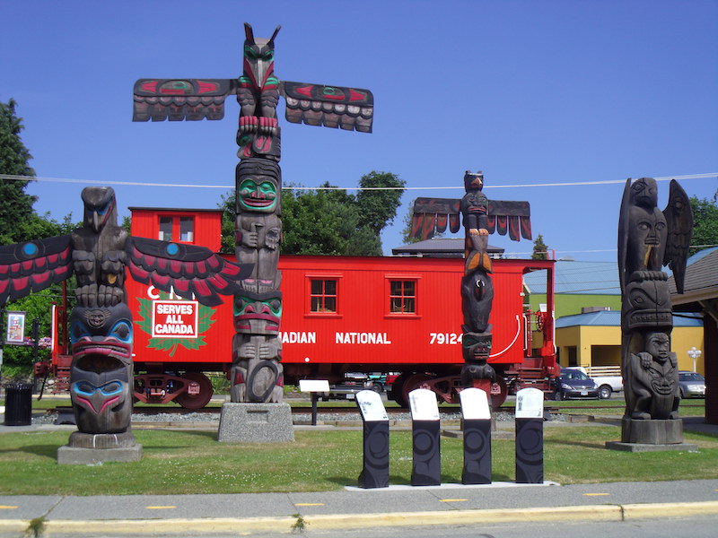 Bei viel Sonnenschein waren Hut und Sonnencreme heute durchaus angesagt. Immer mehr Wochenendausflügler pilgerten teils schwer beladen an den Strand. Wir setzten unsere Reise fort und fuhren an Nanaimo vorbei Richtung Süden bis nach Duncan. Duncan, die Heimat der Cowichan-Küstenindianer, hat sich seit den 1980er-Jahren einen Namen als City of Totems, Stadt der Totempfähle, gemacht. Bei einem Innenstadtspaziergang entlang dem mit aufgemalten Fussspuren markierten Pfad sieht man an die 80 farbenfroh und zumeist kunstvoll gestaltete Pfähle. Nachdem Hajo beim parkieren das Strassenschild etwas „umgestellt“ hatte, haben wir bei einem kleinen Bummel durch Downtown wahrscheinlich knapp die Hälfte der Totempfähle gesehen.