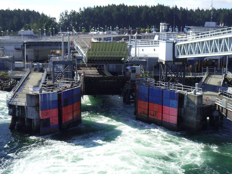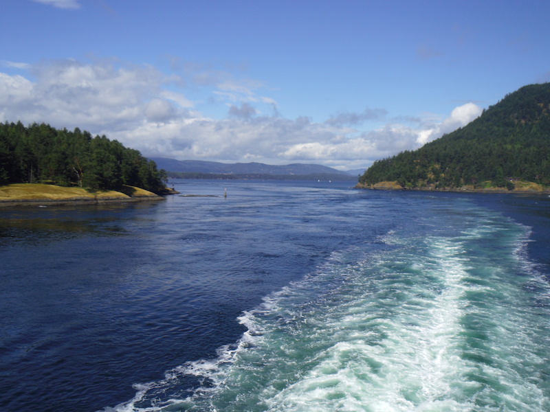 Da der Einweiser zwar wild aber unverständlich mit den Armen herumfuchtelte, und trotz aller Bemühungen eine Interpretation seiner Bewegungen nicht möglich war, blockierten wir am Schluss zwei Spuren auf der Fähre, was ihm nur ein Kopfschütteln entlockte. Nanu, die Fähre war eh nicht voll besetzt und dieses Mal hatten wir wenigstens zum ein- und aussteigen Platz genug. Wir begaben uns bei Sonnenschein aufs Aussendeck und konnten die Abfertigung unseres Schiffes und das ablegen der Fähre mitverfolgen. Wir erlebten eine interessante Fahrt zwischen mehreren Inseln hindurch, unter anderem durch Active Pass, einer Meerenge zwischen Galiano Island und Mayne Island, zwei Golfinseln.