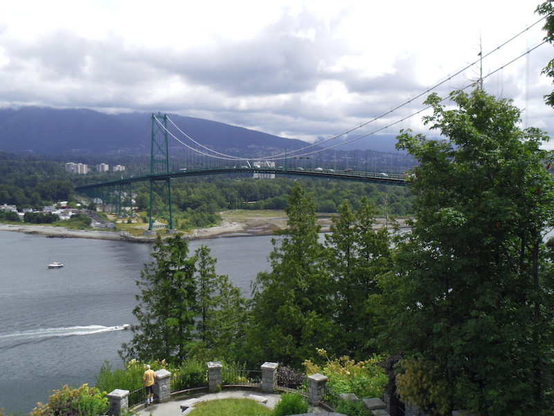 Auf einem Spaziergang liefen wir der Meerespromenade entlang zum Leuchtturm. Immer wieder kamen uns zahlreiche Velofahrer entgegen, wobei extra Velowege gekennzeichnet sind. Mehrere Vermieter boten Drahtesel in verschiedenen Grössen zur Ausleihe an, was rege genutzt wird. Auch viele Einheimische drehen ihre Touren im Park. Danach suchten wir noch die 9 o’clock gun, die sich in der Nähe befinden musste. Jeden Abend um 21.00 Uhr kann man die Nine O’ Clock Gun donnern hören, wenn im Stanley Park einen Schuss abgefeuert wird. Diese schallende, alte englische See-Kanone wurde vor über 100 Jahren in den Stanley Park gestellt. Ursprünglich wurde der Schuss abgefeuert um die heimischen Fischer und Angler zu erinnern, an die täglichen Zeitbeschränkungen zu denken. Jetzt wird es als Zeit-Signal weitergeführt und ist zu einer alten Vancouver Tradition geworden. Zurück an der Busstation nahmen wir den nächsten Trolley bis zum folgenden Stopp am Prospect Point. Von da hat man eine wunderbare Sicht auf die dreispurige Lions Gate Bridge, dessen mittlere Spur je nach Verkehrsaufkommen für die eine oder andere Fahrtrichtung freigegeben wird.