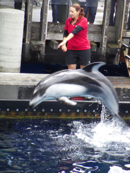 Hier bestiegen wir wieder den Trolley und fuhren durch Chinatown, anschliessend Gastown wo wir die bekannte Steamclock – welche wir Morgen noch anschauen möchten – kurz hören und sehen konnten. Etwas später erfolgte ein Fahrerwechsel. Unser neuer Chauffeur war ein rüstiger Rentner, der sehr viel spannendes auf witzige Art zu erzählen wusste. Es machte Spass ihm zuzuhören. Bei strömendem Regen passierten wir Canada Place und fuhren an unserem Hotel vorbei bis zum Aquarium im Stanleypark. Ganz zur Freude unserer Kinder. Obwohl sie schon einiges erlebt hatten an diesem Tag wurden sie nicht müde, all die vielen Meerestiere zu bestaunen und die verschiedenen Wasserbecken zu besuchen. Zwei Delfine sorgten mit diversen Kunststücken gleich für eine grosse Show, die Seelöwen machten mit lautem Gebrüll und Machogehabe auf sich aufmerksam, die Pinguine machten den Clown und watschelten mit erhobener Nase über die Felsen.