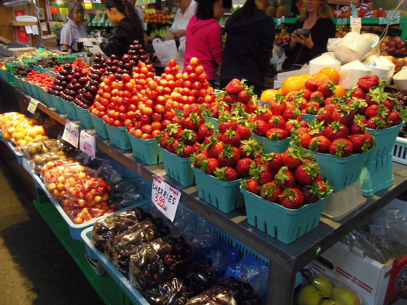 Mit dem Trolley fuhren wir anschliessend an einigen uralten Zedern und Douglastannen vorbei, welche mehrheitlich 2006 einem Hurrican zum Opfer fielen. Der angeblich meist fotografierte Baum weltweit wurde nach dem Sturm mittels einer aufwändigen Konstruktion wieder aufgerichtet. In unserem alten Gefährt fuhren wir weiter bis zur False Creek Fähre, welche uns auf einem Meeresarm bis zur Halbinsel Granville Island übersetzte. Hier befindet sich der täglich geöffnete Public Market. Auch wir stürzten uns in das Gewimmel, um einen Eindruck von den vielen Ständen, den sorgfältig angeordneten Frischwaren und den Gerüchen mitzubekommen.