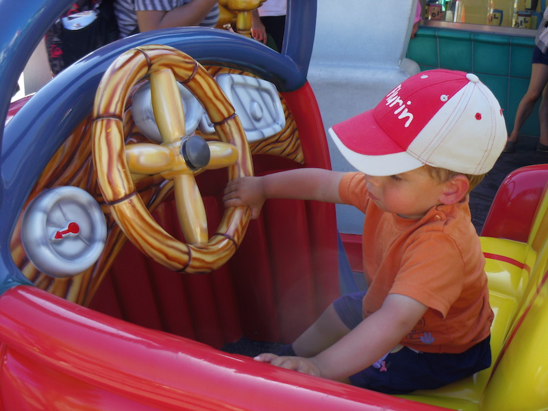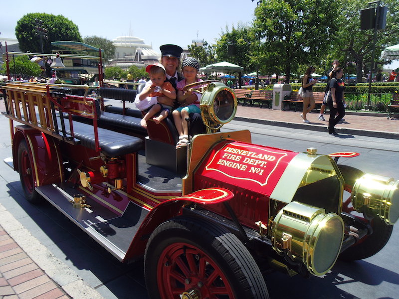 Bis wir jeweils parat sind braucht es seine Zeit und nachdem wir uns in einem nahe gelegenen Shop noch mit ein paar Lebensmitteln eingedeckt hatten, spulten wir los Richtung Anaheim bei Los Angeles. Eine etwa einstündige Fahrt wartete auf uns. Auf der Strasse herrschte viel Betrieb und die Border Patrol, welche unterwegs sämtliche Fahrzeuge stoppte, sorgte auch nicht gerade für Verkehrsfluss. Währenddessen vergnügten sich unsere Kinder auf der Rückbank. Flurin plapperte einige seiner vielen neu erlernten Wörter wie zei-Auto, Gugii oder Autobahm, so dass Papa ihn Quakifrosch oder Plappergei nannte. Flurin fand das gar nicht lustig – nei Papi, so nööd! - und meinte, er sei kein Gaagi-Osh und Papi sei ein Papigei. Endlich in Anaheim angekommen wurden wir auf einen grossen Parkplatz gelotst von wo uns Shuttlebus Woody zum Eingang brachte. Wir waren beim besten Willen nicht alleine (hier hatten auch die Ferien schon begonnen). Es hatte viele Leute und wir mussten überall teilweise lange anstehen. Wir stellten uns darauf ein. Damit nichts schief geht, haben wir Alina einen Zettel in die Tasche gesteckt mit Name und Angaben zu uns und den Informationen, an welche Stelle Alina gebracht werden sollte, falls wir sie verlieren würden. Am Infoschalter zeigten wir unserer Tochter, wie sie die Angestellten des Disneylands erkennen könne, an die sie sich mit dem Zettel wenden müsste, falls sie uns nicht mehr finden sollte. Die ersten paar Meter vom Hauptplatz am Eingang zu den ersten Attraktionen legten wir in einem alten, offenen Fire Engine zurück.