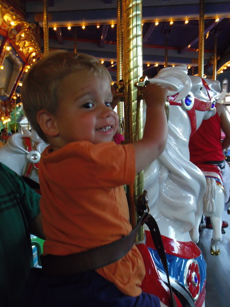 Das grosse King Arthur Carrousel, ein Rösslikarussell, wurde gleich von unseren Kindern gesichtet und bildete unsere nächste Station. Ich stand mit Alina in der Warteschlange an während Hajo mit Flurin einen guten Fotoplatz suchten. Flurin schimpfte wie ein Rohrspatz, da er „au Ühü iitä“ wollte. Alina auf ein Pferd gesetzt gab ich ihr den Gurt des Pferdes daneben und holte rasch Flurin, um ihn auch noch darauf zu setzen. Mir kamen beinahe die Tränen, so sehr strahlte unser Bub, als ich ihn auf das Pferd setzte. Zu meinem erstaunen sass er sehr locker im Sattel und zeigte ein gutes Gleichgewicht, so dass ich ihn kaum mehr halten musste. Er lachte, jauchzte und winkte Papa bei jeder Runde.