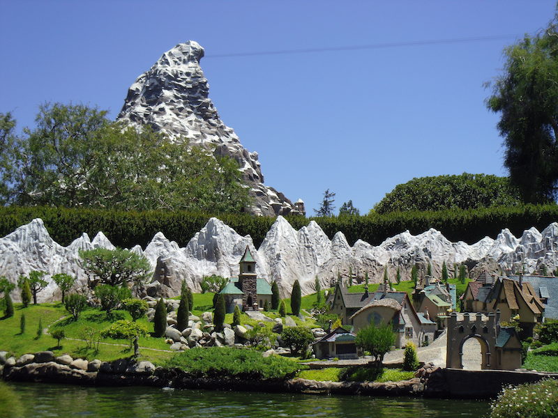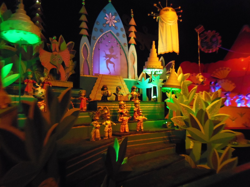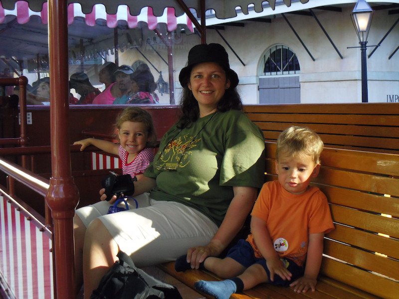 Danach stiegen wir in Tomorrowland auf den Disneyland Monorail um, damit wir auch mit diesem Gefährt eine Runde drehen konnten. Die Autos, welche in der Nähe unter lautem Krach herumkurvten, zogen die Aufmerksamkeit von Flurin auf sich, mussten aber darauf verzichten, da er noch zu klein war. Dafür machten wir noch eine weitere Fahrt mit dem offenen Disneyland Railroad bis zum Frontierland am New Orleans Square. Leider konnten wir keine Fahrt mit dem Mississippi-Dampfer machen, da dieser nicht in Betrieb war. Wir gönnten uns zum Dessert feine, süsse, sündhaft teure Churros und spazierten weiter. Die Big Thunder Mountain Railroad in der Nähe war Alina nicht entgangen und nachdem Hajo sie gefragt hatte, ob sie mitgehe, stürmte sie auch gleich zum Eingang. Dort wurde sie aber aufgehalten, um ihre Körpergrösse zu messen. Die Anforderungen erfüllte sie aber. Die Warteschlangen waren unterdessen etwas kürzer geworden, so dass die beiden bald in den Genuss einer aufregenden Fahrt kamen. Die Actionszenen waren ihr manchmal schon etwas unheimlich, so dass sie sich an Hajo schmiegte und Augen und/oder Ohren mit den Händen zuhielt. Kaum ausgestiegen stürmte sie gleich zu uns und erzählte voller Stolz, wie sie auf der tollen Bahn gefahren sei. Etwas zögerlich fragte ich sie, ob ich wohl auch einmal mitgehen sollte, worauf sie mich gleich am Arm packte und zum Eingang zerrte. Ich müsste keine Angst haben und sie versprach mir, mich bei der Hand zu halten. Etwas unheimlich war ihr auch beim zweiten Mal, sie drückte sich fest an mich und vergrub ihr Gesicht. Danach spulte sie aber trotzdem wieder voller Stolz zu Papa und erzählte ihm, sie hätte mir gezeigt, wie das auf der Big Thunder Mountain Railroad gehe. Auf dem Weg zurück kamen wir wieder am grossen King Arthur Carrousel, dem Rösslikarussell vorbei und kamen natürlich nicht darum herum, gleich nochmals eine Runde zu fahren. Es hatte nicht mehr so viele Leute wie am Mittag, es war mittlerweile schon Abend und dunkler geworden, so dass wir gleich nochmals anstanden und eine zweite Runde Rössli ritten. Diesmal ergatterte sich Hajo ebenfalls eins und gab – ohne Hut – den Cowboy ab. Anschliessend wollten wir noch Dumbo the Flying Elephant gleich nebenan ausprobieren, wir mussten uns aber hinten anstellen und die Wartezeit sollte noch lange dauern, denn direkt vor unserer Fahrt wurde ein Mechaniker auf die Bahn gelassen, der einem Dumbo wieder zum fliegen verhelfen sollte, was er aber auch nach längerem herumschrauben nicht schaffte. Nach dem Elefantenflug machten wir noch eine Bootsfahrt durch it’s a small world, eine kleine Phantasiewelt mit vielen singenden Tieren und Figuren.