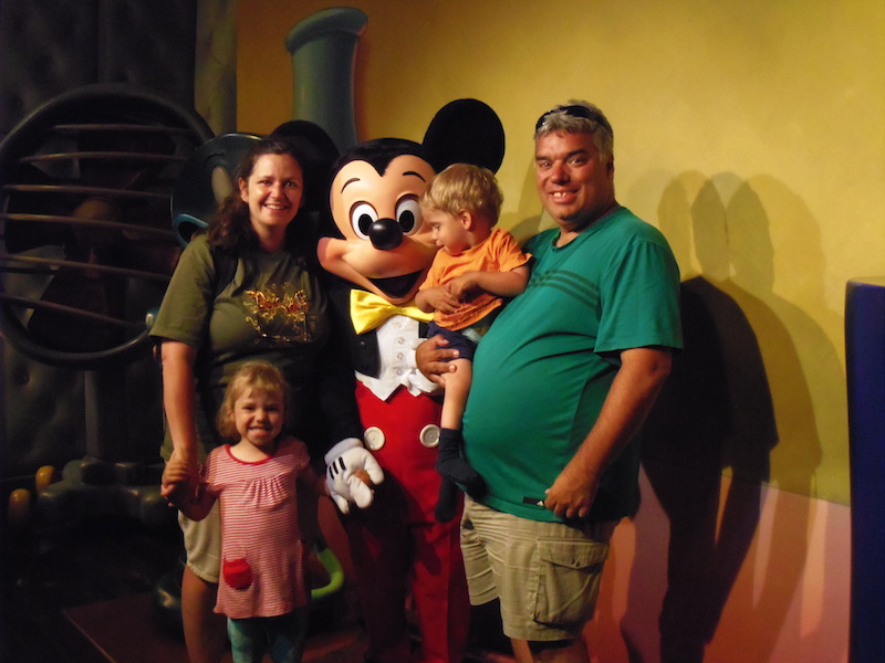 Mittagszeit schon längst überschritten machten wir uns auf ins Mickey’s Toontown, um dort nach einem Mittagessen zu suchen. Es war sehr heiss, die Sonne brannte und wir mussten bei jeder Gelegenheit darauf achten, Schattenplätze zu finden. In einer geschützten Ecke in Toontown verdrückten wir unseren Zmittag und versorgten uns mit reichlich Flüssigkeit. Jeder Trinkwasserhahn war ein obligater Stopp, um unsere Wasserflaschen wieder aufzufüllen. Nun war Alinas grosse Stunde gekommen und sie durfte auf Einkaufstour gehen. Im nahe gelegenen Shop gab es diverse Artikel von Mickey Mouse und seinen Freunden. Alina wählte ein Röckli mit Minnie Mouse und erbettelte ein passendes Täschli. Danach war sie selig. Überhaupt war sie den ganzen Tag total glücklich und gab sich viel Mühe, schön bei uns zu bleiben, damit wir einander nicht verloren. Als Pluto plötzlich wieder aus seinem Staff only Türchen auftauchte kannte sie kein Halten mehr, sie musste unbedingt zu ihm. Hajo spulte ihr hinterher und plötzlich stand sie wieder ausser Atem bei mir, sie müsse unbedingt sofort den Fotoapparat haben für ein Porträt mit Pluto. Genau so schnell war sie wieder fort. Anschliessend suchten wir im Mickey’s House nach dem Besitzer und wanderten dabei labyrinthartig durch das ganze Haus der Trickfilmfigur. Vom Wohnzimmer über die Waschküche, die Kochnische und die Garage, die Werkstatt mit vielen Farbkübeln und einem Flugzeug an der Decke, den Gemüsegarten, in dem die Hasen gerade die Karotten auffrassen bis in den Hühnerstall und anschliessend in den Filmraum führte der Weg uns in einer knappen Stunde zu einem persönlichen Meeting mit der Maus.