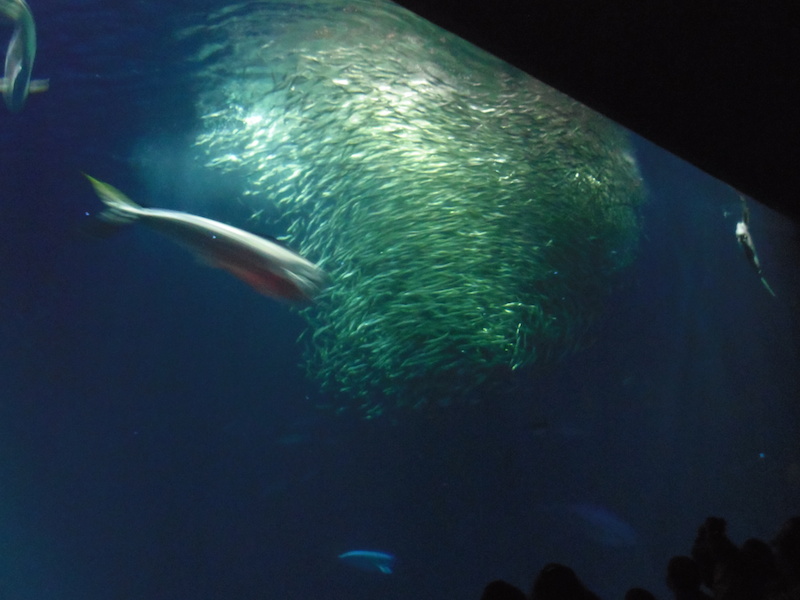 In einem dunklen Durchgang konnten wir verschiedene Quallen in allen Grössen und Farben bestaunen, wie sie durch das Wasser schwebten. Gerade rechtzeitig trafen wir beim Hochseebecken ein. Es fand kurz darauf die Fütterung der Tiere statt. Zuerst wurden die langsamen Schwimmer, das heisst, die Meeresschildkröte und der riesige Sonnenfisch, anschliessend die schnellen Thunfische, Dorados und Hammerhaie und zum Schluss der Schwarm Sardinen gefüttert, welche sich in riesigen Scharen zu beeindruckenden Formationen zum Futter vorpirschten.