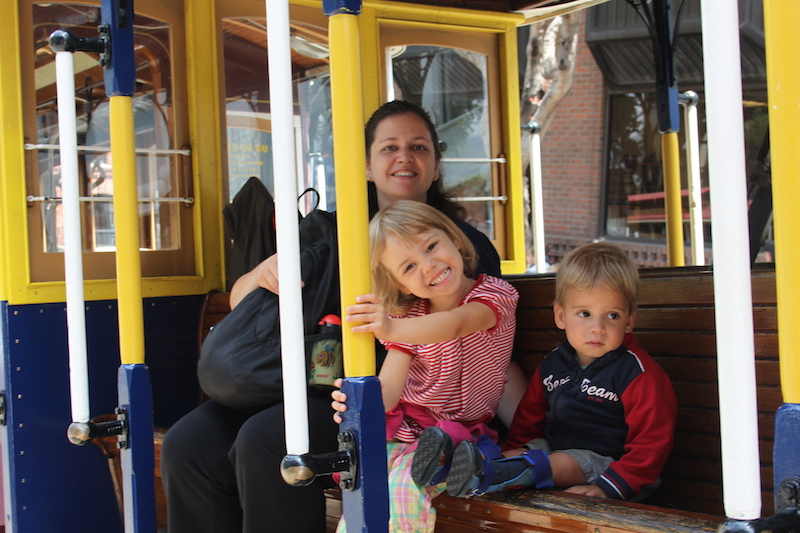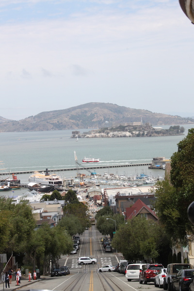 Erst kurz vor dem Einsteigen stellten wir fest, dass wir vorgängig ein Ticket in der Seitenstrasse organisieren sollten, um einer Busse zu entgehen und dafür mussten wir einige hinter uns wartende Touristen an uns vorbeiziehen lassen. Ich und die Kinder erhielten eine Sitzgelegenheit auf der Seitenbank draussen, Hajo hängte sich stehend an die Seitenstangen. Rumpelnd und mit ruckartigen Bremsmanövern kämpfte sich die Holzkarosse die Hügel von San Francisco hoch und runter und nach einigen starken Kurven erreichten wir schliesslich den Fisherman’s Wharf.