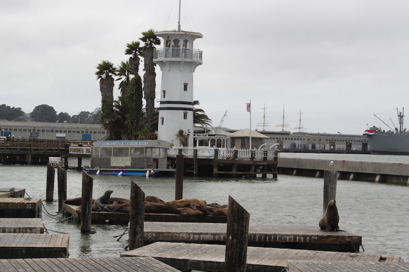 Die Wartezeit hatte auch unsere Mägen hungern lassen und so gingen wir gleich in einem Restaurant etwas essen bevor wir am Pier 39 nach den Seelöwen Ausschau hielten. Die meisten Flosse waren leer, denn die meisten Seelöwen ziehen um diese Jahreszeit zum Gebären ihrer Jungen in den Süden und auf kleine Steininseln. Ein paar wenige, hauptsächlich Männchen und Jugendliche, hielten am Pier die Stange und lagen kreuz und quer faul auf einem und demselben Floss herum. Nur ein „Bluffer“ präsentierte sich in seiner ganzen Grösse auf einem separaten Floss und ein anderes Kaliber, es schien leicht verletzt zu sein, bevorzugte einen eigenen Platz abseits der Gruppe.