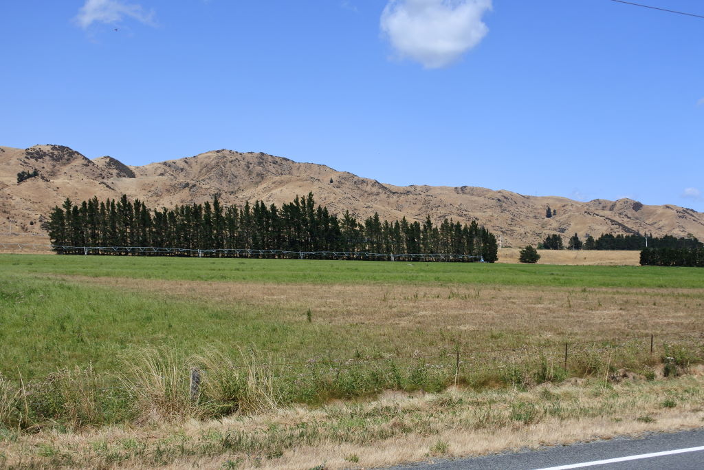 Wir verliessen Christchurch Richtung Norden durch eine hügelige Landschaft mit teils starken Böen. Nach etwa halber Strecke führte uns die Strasse ins Landesinnere Richtung Berge. Wir fuhren an grossflächig bewässerten Feldern vorbei, auf denen Kühe und Schafe, vereinzelt auch Ziegen weideten. Auch Wein wird hier angebaut. Sofern nicht bewässtert oder bewaldet zeigt sich die Landschaft gelbbraun, die Brandgefahr ist hoch und es gilt absolutes Feuerverbot.