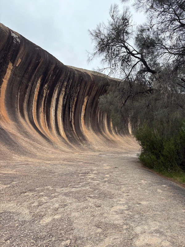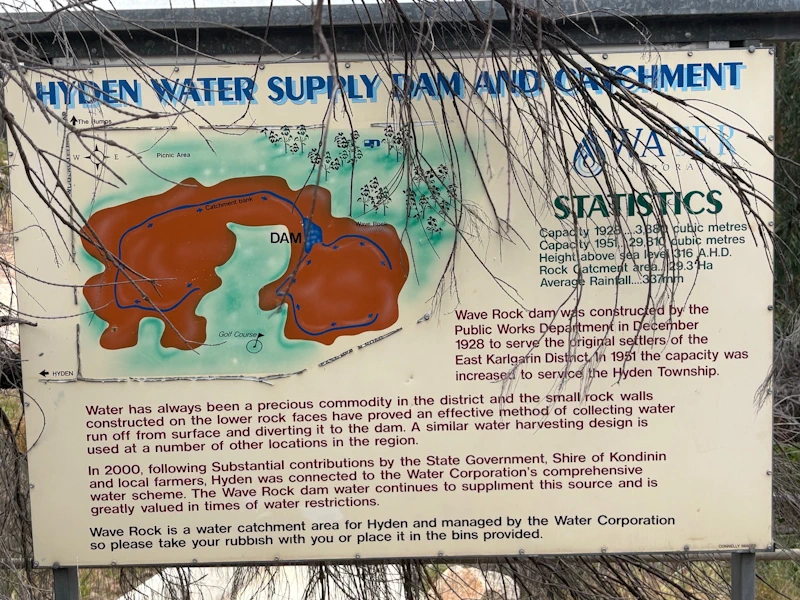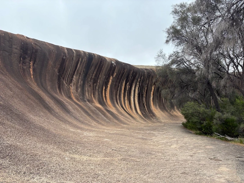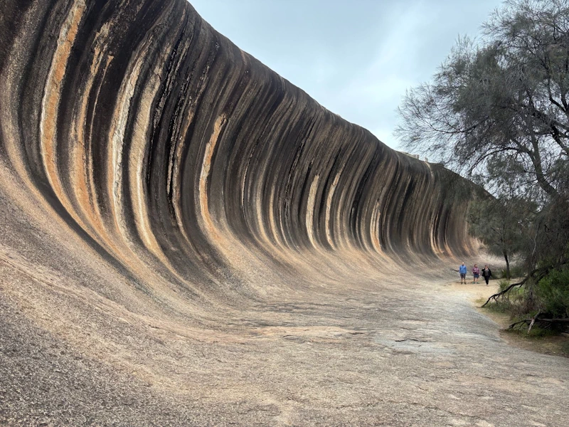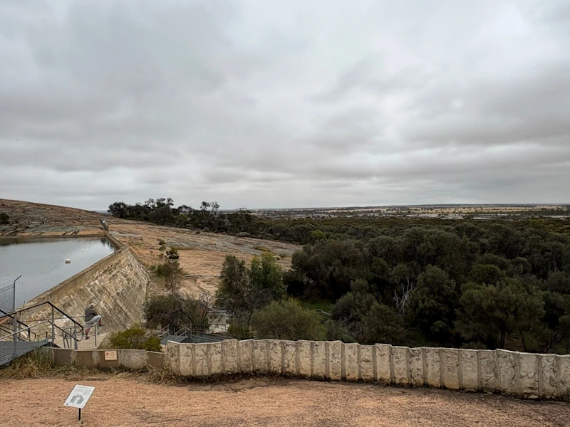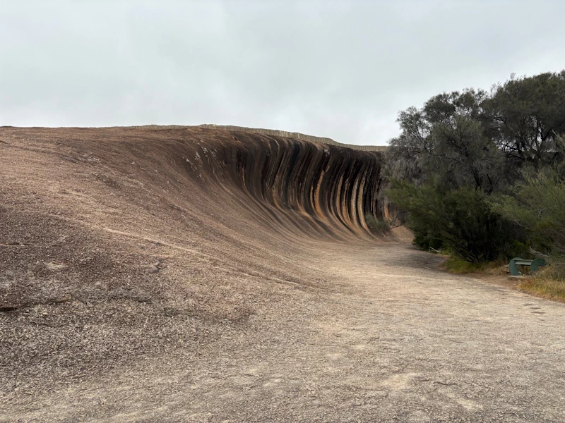 Nachdem wir die Campervermietung per E-Mail über die Mängel informiert hatten parkierten wir unser Wohnmobil ausserhalb des Campingplatzes und machten uns auf, den nahe gelegenen Wave Rock zu erkunden. Sehr eindrücklich, wie mitten im Outback eine riesige Welle mit entsprechenden Mustern sich vor einem aufbaut. Über eine Treppe gelangt man sogar auf den Peak der Welle, von wo aus man einen schönen Ausblick auf die Umgebung hat. Um Niederschläge zu sammeln und in das nahe Staubecken zu leiten wurde extra ein (hässliches) Mäuerchen auf dem Rock errichtet. Wie bedauerlich.