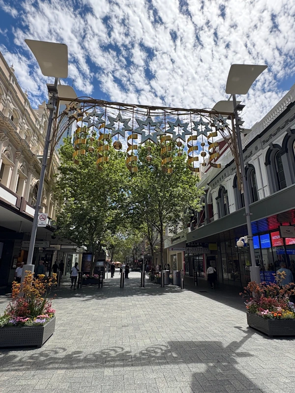 Es war schön, dass uns zum Abschluss Perth noch mit Sonnenschein und T-Shirt-Wetter empfing. Seit unseren Tagen in Perth vor zwei Wochen hatte sich Perth in Vorweihnachtliche Stimmung gestürzt, Strassenlaternen, Promenaden und Läden hatten sich mit Schleifen, Kugeln und Girlanden geschmückt.