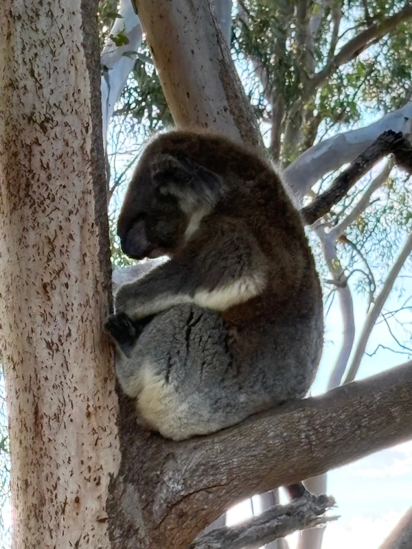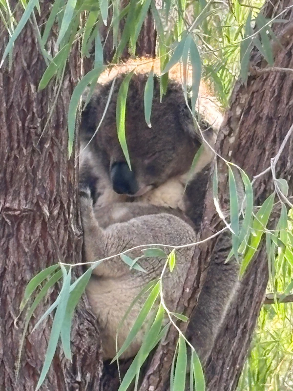Wir liessen uns einen unserer leeren, deponierten Koffer aushändigen und begaben uns auf die Fahrt im Freitag Nachmittag Rush zum Yanchep Nationalpark, ca. eine Stunde nördlich von Perth. Nachdem wir einen ersten Koffer gepackt hatten genossen wir die Ruhe im wunderschönen, grünen Park und konnten den grasenden Kängurus mit ihren Jungen im Beutel zusehen. Am Rande des Feuchtgebietes warnte ein Schild vor hochgiftigen Schlangen, welche in der Umgebung vorkommen können. Wir betraten ein Gehege, in dem fünf Koalas ihr zu Hause haben. Normalerweise kommen Koalas in Westaustralien nicht vor, sie wurden aus Ost- und Südaustralien hierher gebracht.
