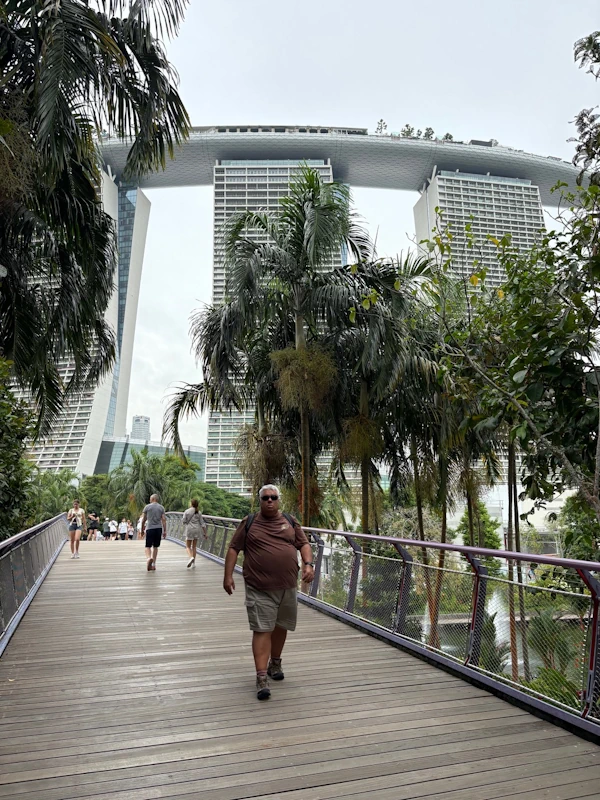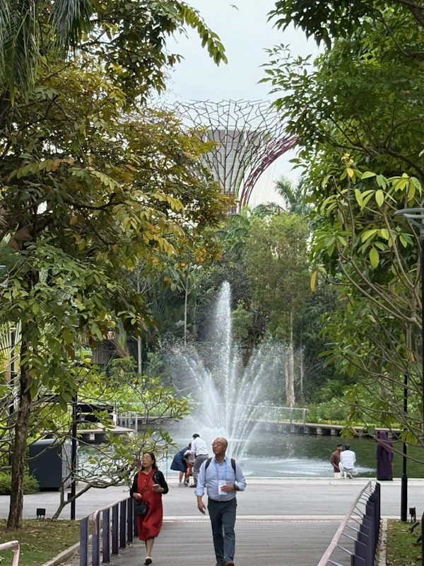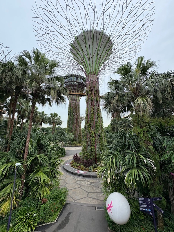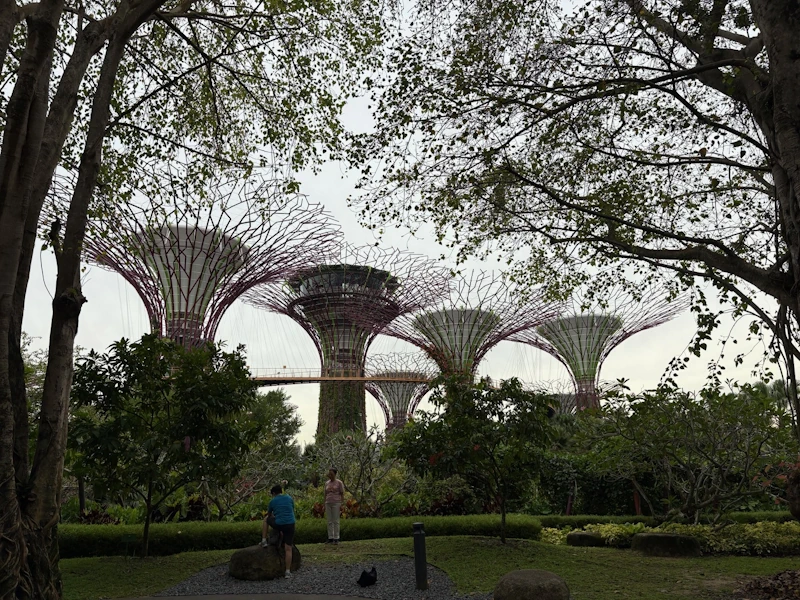 Den Transport zum Flughafen hatten wir schon am Tag vorher organisiert (unser Taxifahrer hatte uns seine Visitenkarte hinterlassen und wir hatten ihn für den späteren Nachmittag aufgeboten). So blieb noch etwas Zeit, durch die Stadt zu ziehen. Wir begaben uns mit der Metro zur Marina Bay, um die Gardens by the Bay mit seinen grossen künstlichen Bäumen, den Supertrees, von der Lichtershow bei Tag zu sehen.