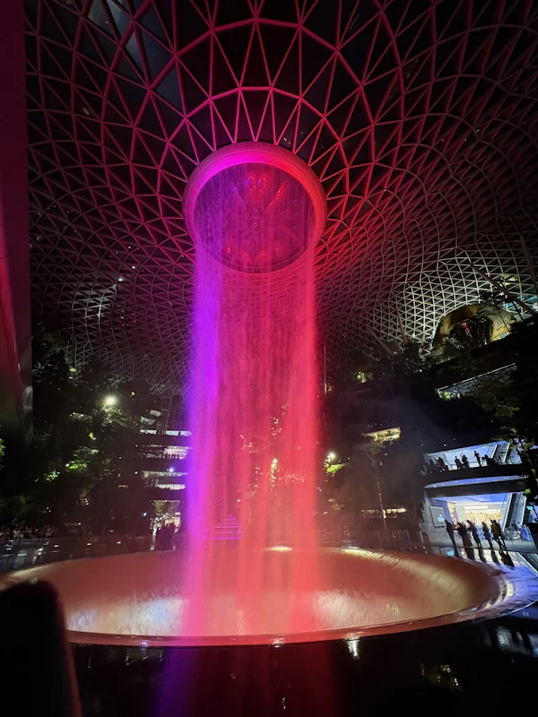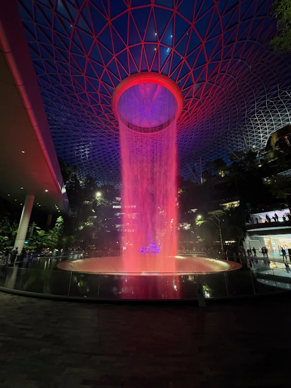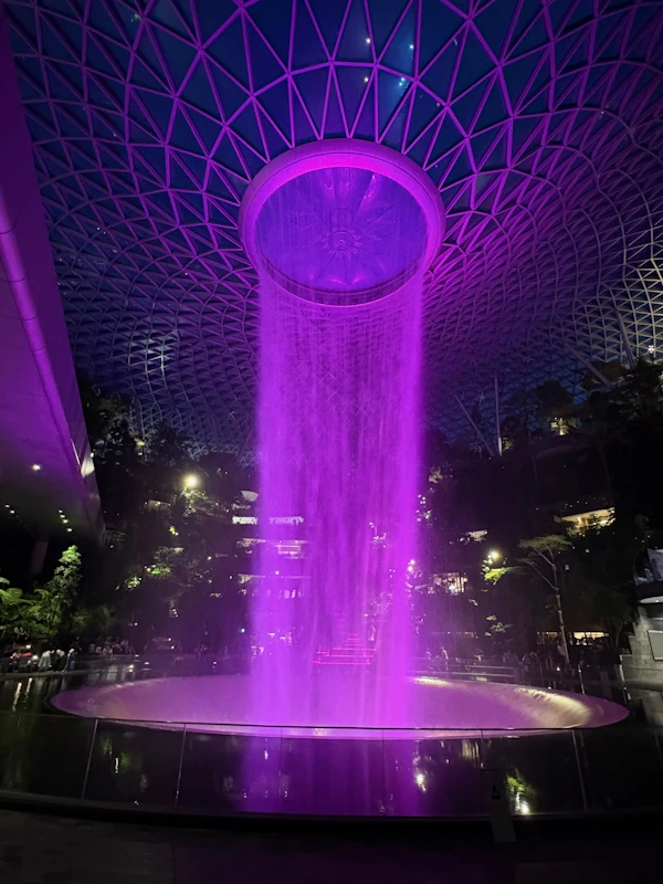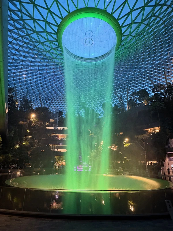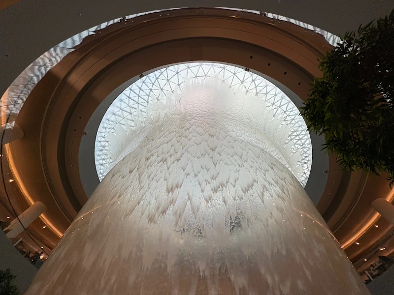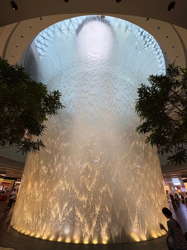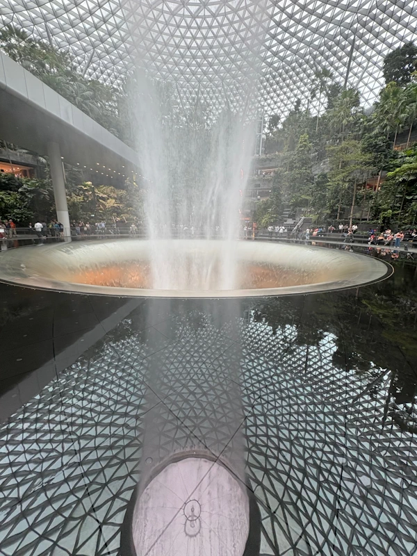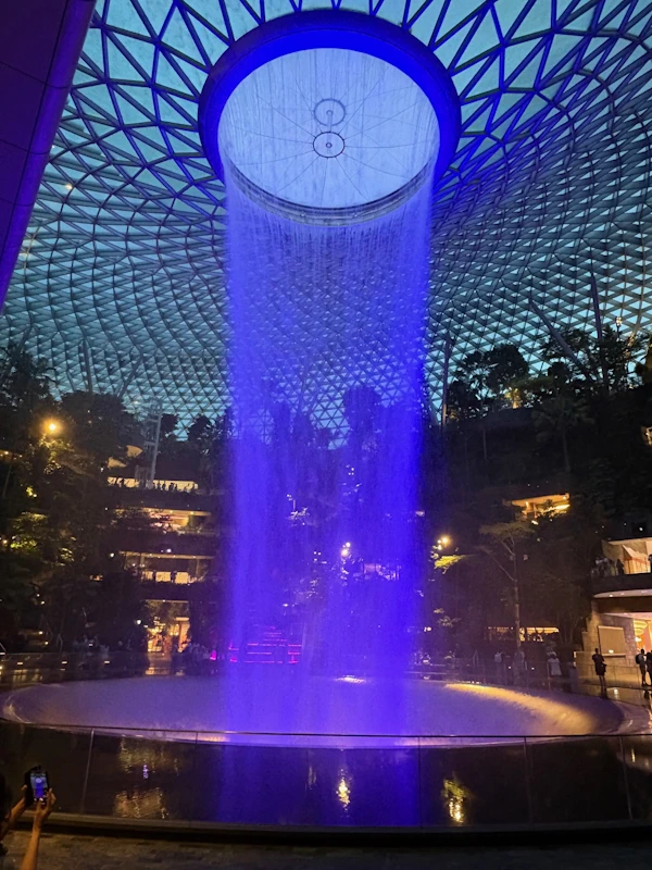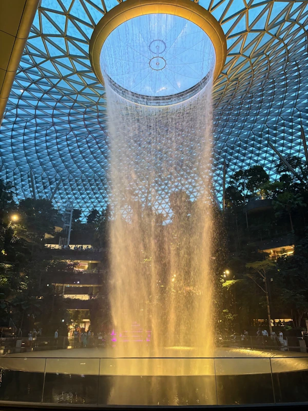 Der HSBC Rain Vortex ist ein Wunderwerk der modernen Technik und die Hauptattraktion des Jewel Changi. Der HSBC Rain Vortex ist der höchste Indoor-Wasserfall der Welt mit 40 Metern Höhe im Zentrum des Jewel Changi Airport in Singapur. Er befindet sich in einem futuristischen Gebäude, das von einer terrassierten Gartenanlage namens Forest Valley mit Tausenden von Bäumen und Sträuchern umgeben ist.