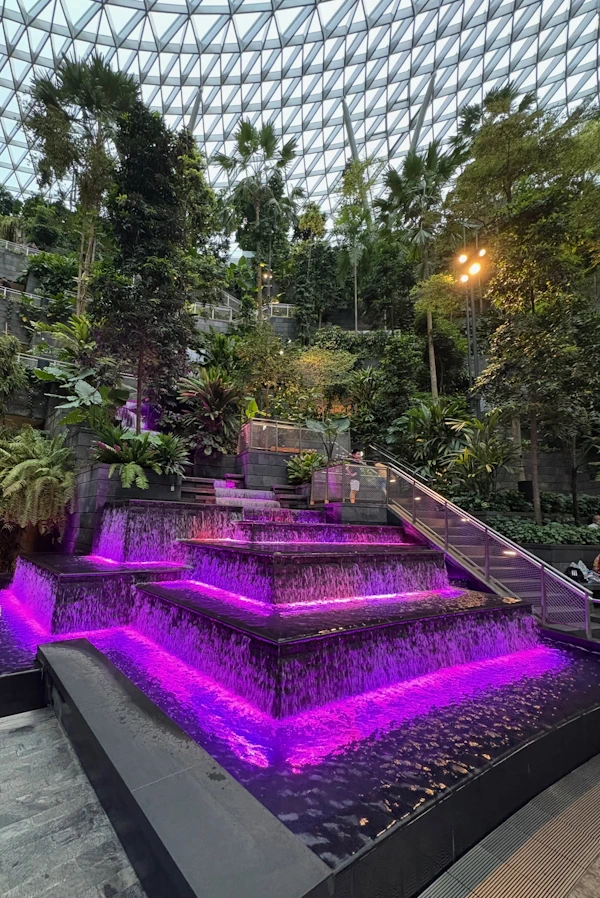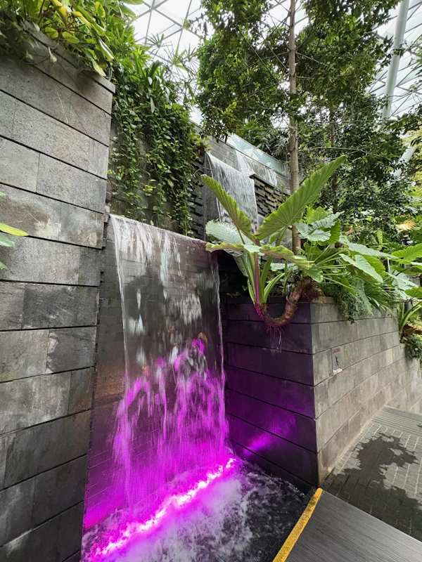 Auf verschiedenen Etagen konnte man den Wasserfall und die vielen Pflanzen bestaunen. Zunächst bei Tageslicht veränderten sich die Farben des Wasserfalls und seiner Umgebung mit Einbruch der Dunkelheit. Ausserdem wurde der Wasserfall mit verschiedenen Farben beleuchtet, ein gigantisches Schauspiel und ein schöner Abschluss unseres Singapur-Aufenthalts.