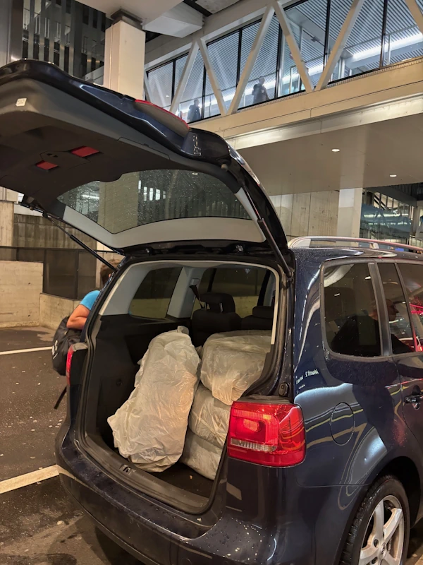 Bei den Parkplätzen holte uns netterweise wieder Michi ab, nochmals vielen Dank an dieser Stelle. Wir schauten alle nicht schlecht aus der Wäsche als er den Kofferraum öffnete: darin befanden sich die vier Sommerpneus, welche er während unserer Abwesenheit freundlicherweise durch die Winterfinken tauschte. Wie sollten wir nun unseren ganzen Plunder inklusive Rollstuhl in unserem schon gut besetzten Touran verstauen? Gute Einfälle waren gefragt. Eine Überlegung war, Gepäckstücke am Flughafen einzuschliessen und später abzuholen. Es hatte aber niemand richtig Lust darauf, nochmals an den Flughafen zu fahren. Würden wir es irgendwie schaffen, doch alles heim zu transportieren? Zwei Koffer konnten wir mal neben den Pneus verstauen. Mit etwas würgen und murksen brachten wir auch noch eine Reisetasche in den Kofferraum. Alina und Flurin erklärten sich bereit, die verbleibende grosse Reisetasche auf dem Schoss zu transportieren. Ich bot mich an, den Rollstuhl auf dem Beifahrersitz, welcher ganz nach hinten gerückt werden musste, zwischen die Beine zu nehmen. Da uns einfiel, dass die Räder abnehmbar sind und die Räder gerade noch zu oberst im Kofferraum verstaut werden konnten, verkleinerte sich der Rollstuhl soweit, dass die Beifahrertür auch geschlossen und ich gleichzeitig noch die Sporttasche und meinen Rucksack hüten konnte. Hajo quetschte sich mit Rucksack auf der Rückbank neben die Kinder. Tatsächlich haben wir es geschafft, alles in unserem Auto unterzubringen!
